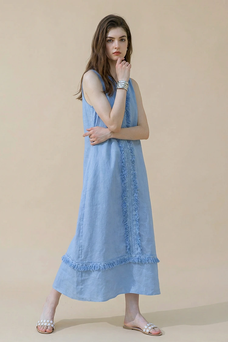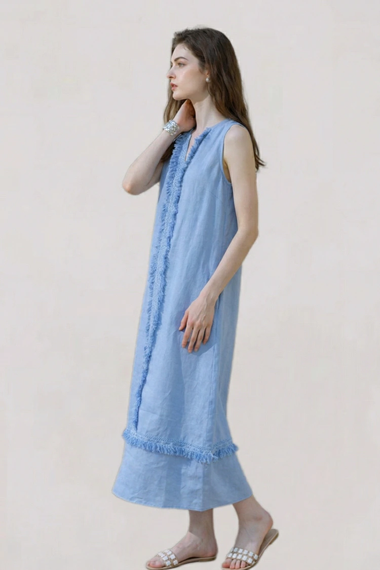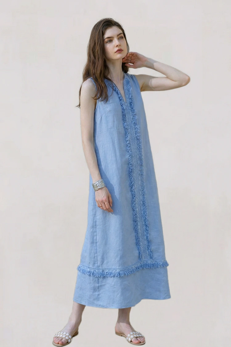 Um den Kernanforderungen von Sommereinkäufen im Großhandel gerecht zu werden, verfügt das stilvolle Damen-Maxikleid aus Leinen über ein lockeres Design, das Komfort und Inklusivität in Einklang bringt. Es passt zu verschiedenen Körpertypen, egal ob schlank oder leicht mollig, und kann von jedem problemlos getragen werden. Dadurch wird die Zielgruppe für Verkäufe deutlich erweitert und der Return on Investment für Einkäufe erhöht. Das ärmellose Design mit V-Ausschnitt ist erfrischend und gepflegt und eignet sich für heißes Sommerwetter. Gleichzeitig kann der V-Ausschnitt die Schulter- und Halslinien gekonnt verändern, die Halsproportion verlängern und den weiblichen Charme der Frau hervorheben. Das lange Kleiddesign hat einen guten Drapierungseffekt, fällt auf natürliche Weise von den Schultern ab und deckt überschüssiges Fett an Taille, Hüfte und Beinen effektiv ab, wodurch die Mängel der Figur minimiert werden. Beim Gehen vermittelt es ein anmutiges und elegantes Gefühl mit einer starken Atmosphäre. Dieses lange Kleid eignet sich für verschiedene Sommerszenarien. Es kann allein getragen werden, um einen französischen Freizeitstil zu kreieren, eignet sich für Stadtspaziergänge, Wochenendtermine oder als Strandurlaubskleidung, eignet sich für die Freizeitatmosphäre am Meer und ist an verschiedene Szenarien anpassbar.