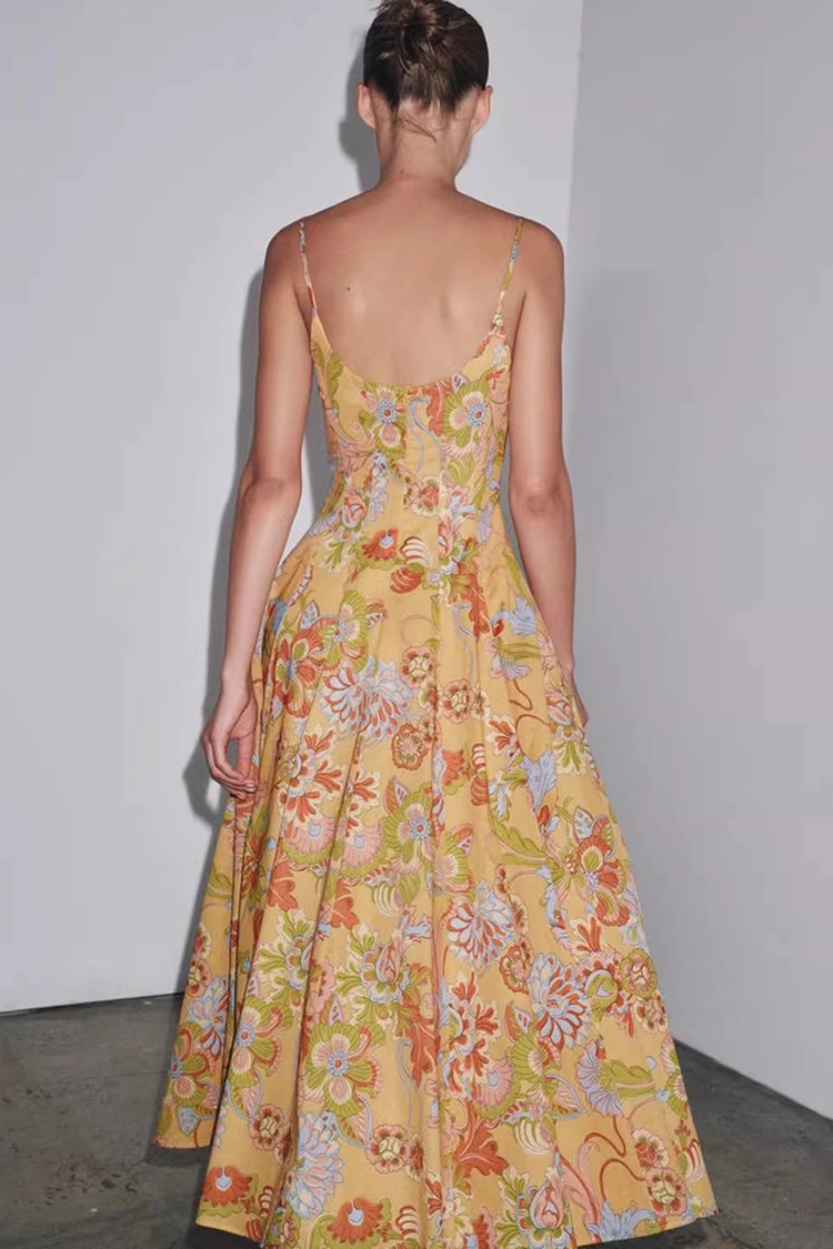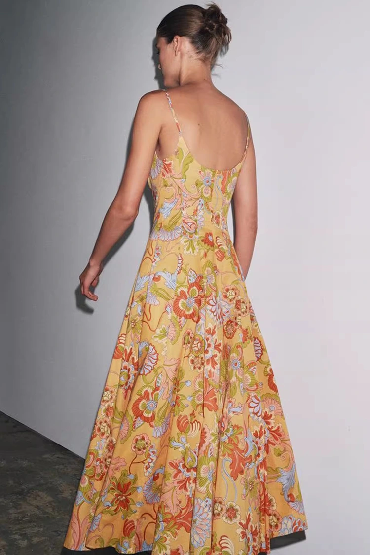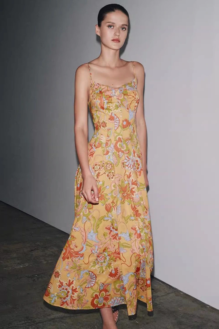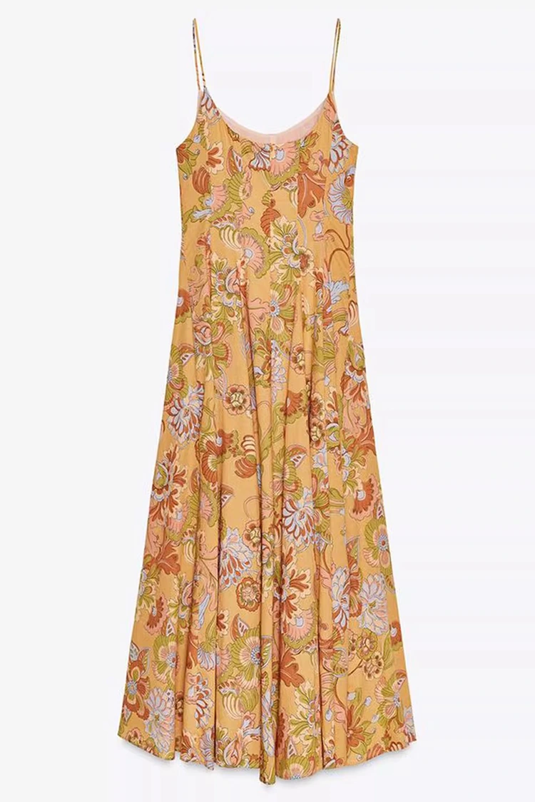 Das Sommerkleid mit Blumendruck für Damen aus Baumwolle hat eine hellorange Grundfarbe und reich strukturierte Blumendrucke auf der gesamten Oberfläche. Die warmen und sanften Töne bringen Vitalität, als würde ein ganzer blühender Sommergarten am Körper getragen. Es kombiniert eine retro-romantische Atmosphäre mit einem sommerlichen, entspannten Gefühl. Die Silhouette zeichnet sich durch ein ärmelloses und halshängendes Design mit klaren und erfrischenden Linien aus, die die Schulter- und Halslinien gekonnt freilegen, die Figur proportional formen und sich gleichzeitig von den Zwängen kurzer Ärmel lösen können, um den Kleidungsbedürfnissen des heißen Sommers gerecht zu werden. Der Rocksaum ist locker und gemäßigt, nicht wählerisch in Bezug auf die Körperform und kann kleinere Mängel an Taille, Bauch und Beinen leicht verbergen, was für Frauen aller Körpertypen sehr angenehm ist. Die perfekte Kombination aus Retro-Print und schlanker Silhouette ermöglicht es diesem Kleid, nicht nur den weiblichen Charme von Frauen zur Geltung zu bringen, sondern auch einen lässigen und entspannten Stil beizubehalten, die Grenzen eines einzelnen Outfits zu durchbrechen und sich für die Kreation an verschiedene Stile anzupassen.