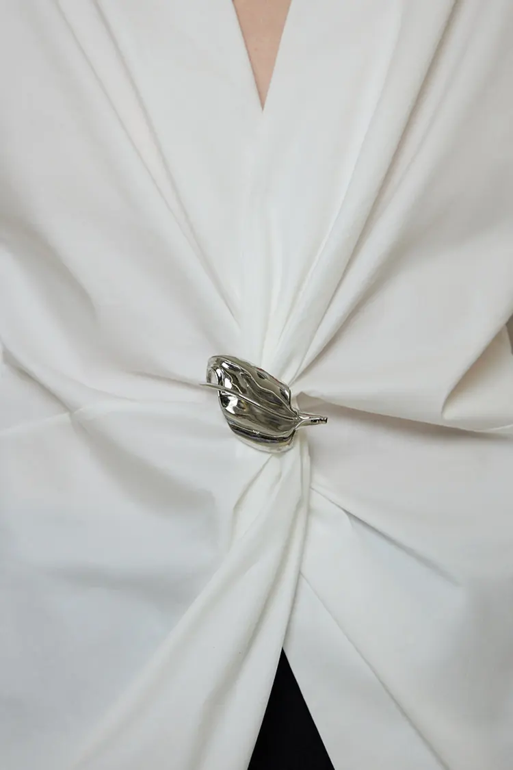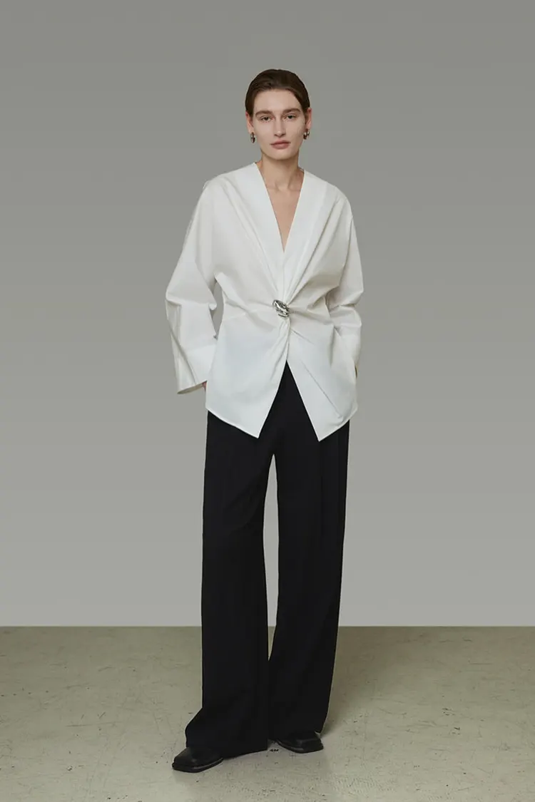 Die Damen-Partybluse mit Metallschnalle verfügt über einen asymmetrischen Taillenknoten in Kombination mit dreidimensionalen Metallknöpfen zur Dekoration. Der visuelle Fokus liegt auf der natürlichen Betonung der Taille und der Betonung der Kurven. Außerdem werden Falten verwendet, um die Figur weicher zu machen und ein hohes Maß an Flexibilität für verschiedene Körpertypen zu bieten. Der gekreuzte V-Ausschnitt ist ordentlich und elegant, mit einem frischen und glatten Stoff, der leicht ist und nicht zusammenfällt. Es kombiniert die Zweckmäßigkeit eines Hemdes für den täglichen Gebrauch mit dem modischen Reiz eines Party-Oberteils und ermöglicht so vielseitiges Tragen und starke visuelle Wiedererkennung.