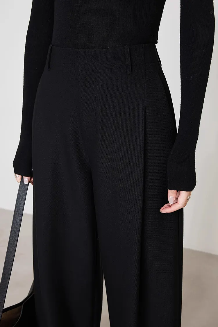 Die Plissee-Anzughose für Damen besteht aus einer wissenschaftlich vielfältigen Stoffzusammensetzung, nämlich 65 % Polyester + 20 % Viskose + 6 % Wolle + 6 % Lyocell + 3 % Elasthan. Diese Kombination verleiht der Hose mehrere Vorteile und sorgt dafür, dass sowohl die Textur als auch der Tragekomfort erstklassig sind. Der Stoff hat eine glatte und klare Textur und strahlt eine gepflegte Qualität aus, die perfekt zu den professionellen Eigenschaften von Anzughosen passt. Darüber hinaus zeichnet es sich durch eine hervorragende Elastizität aus, die für ein angenehmes Tragegefühl ohne Einengung sorgt und so einen ganztägigen Tragekomfort ermöglicht und den Anforderungen langer Pendelfahrten am Arbeitsplatz gerecht wird. Wir können die Stoffkomponenten flexibel an die Markenpositionierung und die spezifischen Anforderungen der Käufer anpassen, uns präzise an die Ästhetik- und Tragebedürfnisse verschiedener Märkte anpassen, die Homogenität durchbrechen und den Käufern helfen, exklusive Wettbewerbsvorteile zu schaffen, wodurch die Marktakzeptanz der Produkte weiter erhöht wird.